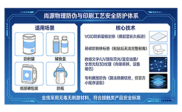 在物理防伪与印刷工艺层面,尚源坚持安全与防护双优先。全线采用无毒无刺激,符合接触类产品安全标准,适配奶粉罐、辅食盒、纸尿裤包装、奶瓶等直接或间接接触场景。核心技术包括:VOID防拆留痕封条,一经揭起即显长久痕迹,杜绝二次封装与翻新;易碎防转移标签,粘贴后无法完整剥离,从源头阻断标签复用;微缩文字、UV隐形荧光、温变油墨、全息光刻3D纹理等高精度工艺,肉眼易辨、设备难仿,快速实现直观验真;专利藏图防伪,以算法隐藏专属信息,仅官方小程序可读取,隐蔽性强、仿制成本较高。
